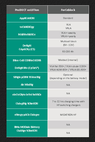 Following the long and successful experience of EW (Energy At Work) batteries, the new FORCEblock range has been Designed to be a complete and reliable solution for ALL Those LIGHT MOTIVE POWER applicatiosn such as EV, Cleaning machines, small pallet trucks, aerial platform and Lifts, as well as wheelchairs and golf cars. Now available in vented and sealed version, both flat and Tubular plates models can be defined to properly satisfy the Specific application.